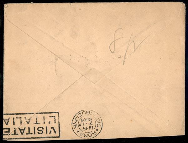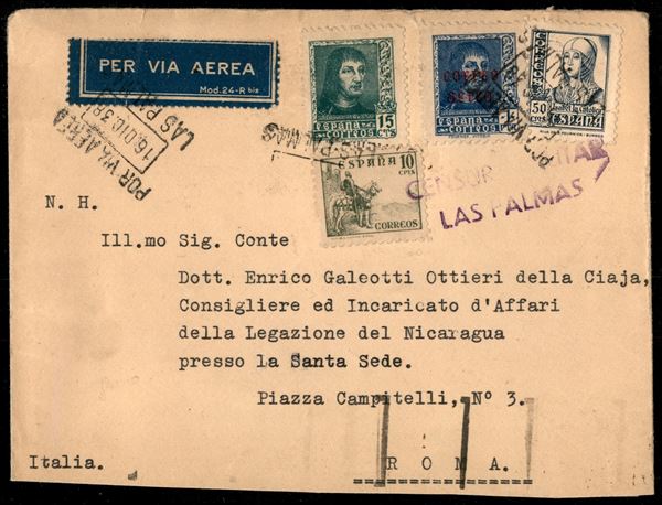 Guerra Civile - Aerogramma affrancato per 1,75 pesetas (767 + 775 + 791 + 796) da Las Palmas a Roma del 16.12.38 - censura