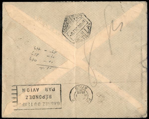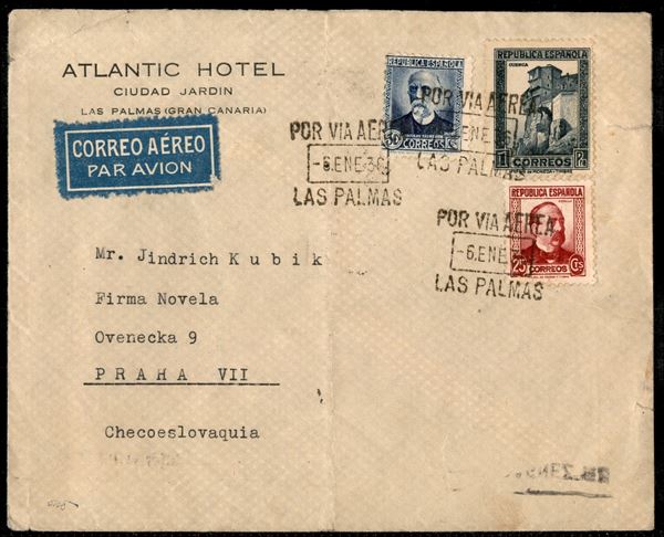Guerra Civile - Aerogramma affrancato per 1,75 pesetas (627 + 630 + 640) da Las Palmas a Praga del 6.1.36