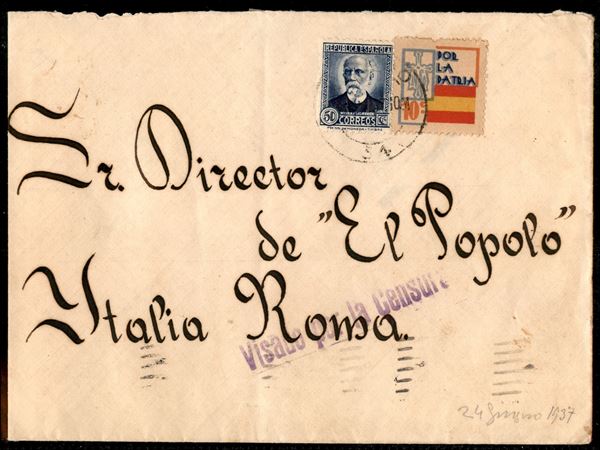 Guerra Civile - Busta affrancata con 10 cent Por La Patria + complementare (640) per Roma del 24.6.37 - censura