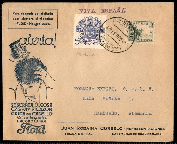 Guerra Civile - Busta affrancata con francobollo sovrapprezzo 5 cent Pro Las Palmas + complementare (767) da Las Palmas a Amburgo del 14.8.37