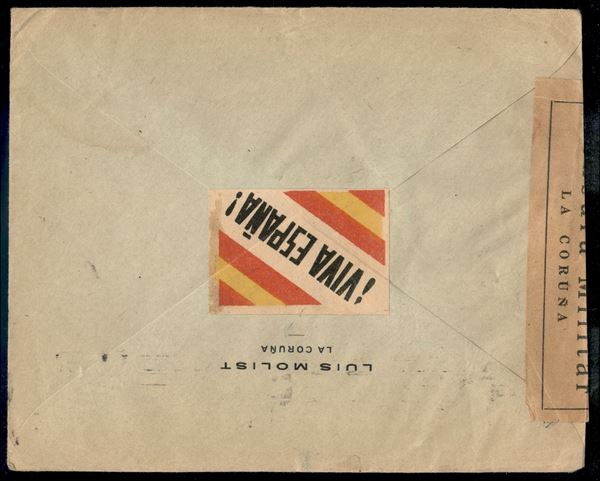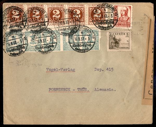 Guerra Civile - Busta affrancata con striscia di cinque non dentellata del 1 cent (764) + striscia di cinque del 2 cent (765) + complementari (766 + 773) da La Coruna a Poessneck del 9.9.37 - annullata in transito a Frankfurt