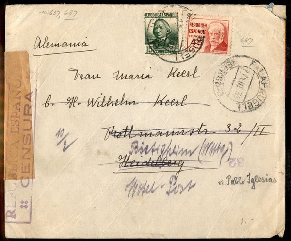 Guerra Civile - Busta affrancata per 60 cent (637 + 687) da Palatrugell a Heidelberg del 27.1.38 - censure