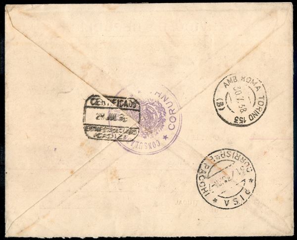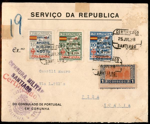 Guerra Civile - Busta dal Consolato Portoghese di Em Em Corunha da Santiago a Pisa del 25.7.38 affrancata con tre francobolli sovrapprezzo (10 + 50 cent/10 + 1 pta/10 + 2 pta) + 1 pesetas con dentellatura orizzontale spostata in alto (784) usato a validità scaduta