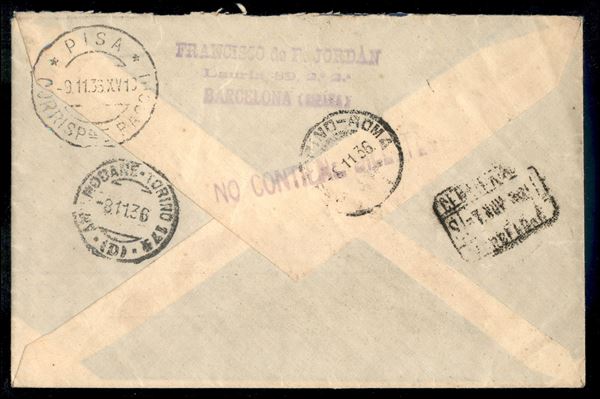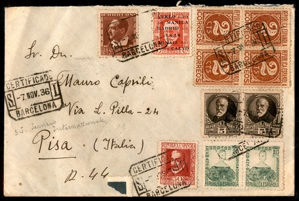 Guerra Civile - Busta raccomandata affrancata con 11 valori da Barcellona a Pisa del 7.11.36