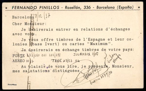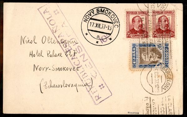 Guerra Civile - Cartolina affrancata con francobollo sovrapprezzo 5 cent + complementari da Barcellona a Novy Smokover del 9.12.37 - censura