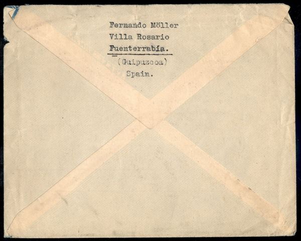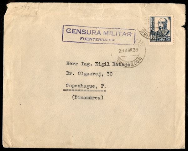 Guerra Civile - Censura Militar Fuenterrabia (viola) - busta affrancata con 70 cent Isabella (777) per Copenhagen del 29.4.39