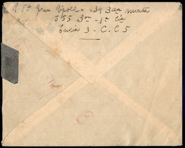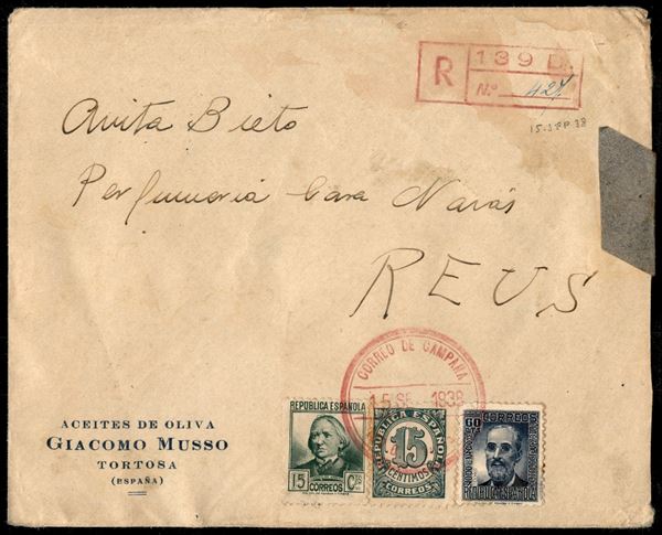 Guerra Civile - Correo de Campana 15.9.38 - raccomandata da Tolosa a Reus affrancata per 90 cent (637 + 690 + 698) - censura