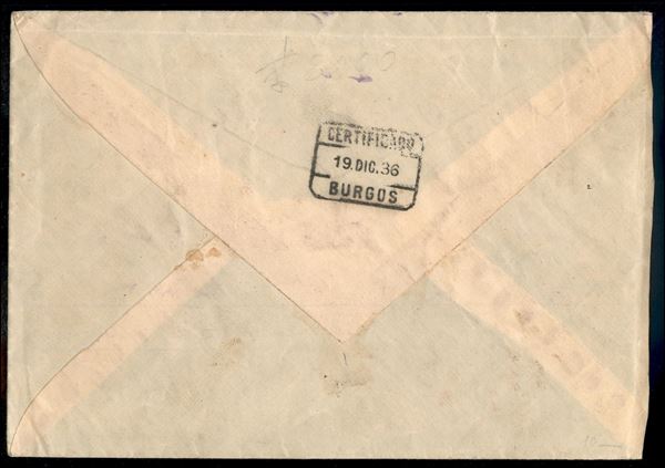 Guerra Civile - Raccomandata affrancata con quindici esemplari del 2 cent (765) + due 15 cent tutti annullati CARTERIA DE VALMELA (violetto) da Valmela a Burgos del 19.12.36