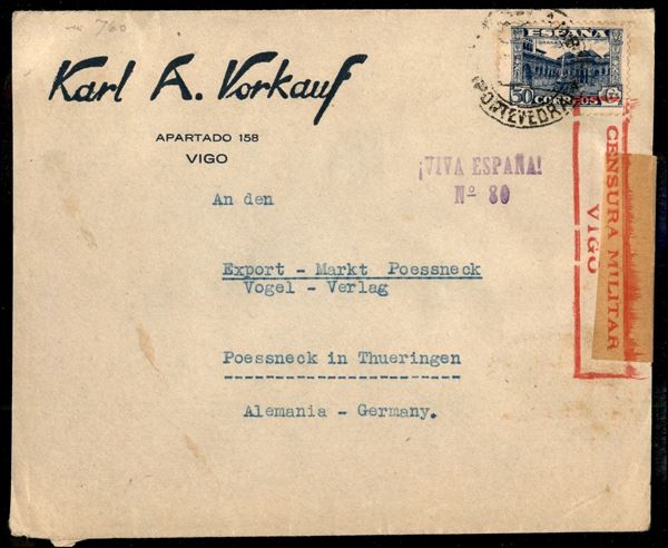 Guerra di Spagna - 30 cent (760) + Viva Espana N° 80 su busta da Vigo a Possneck - censura