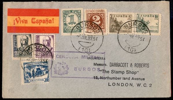 Guerra di Spagna - Busta affrancata con 10 cent Crociata contro il freddo + complementari da Burgos a Londra del 10.7.37