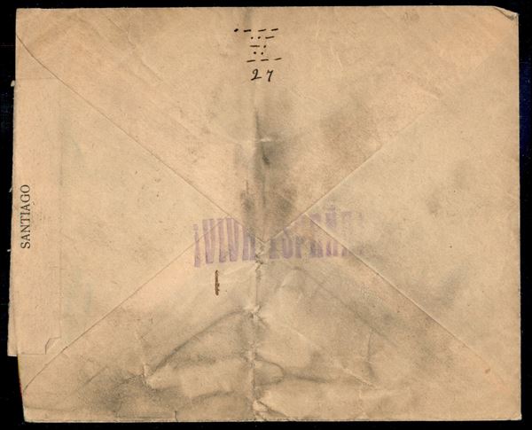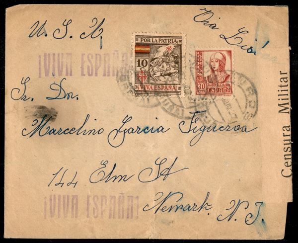 Guerra di Spagna - Busta affrancata con 10 cent Por la Patria/Viva Espana + complementare da Burgos per Newark del 27.6.37