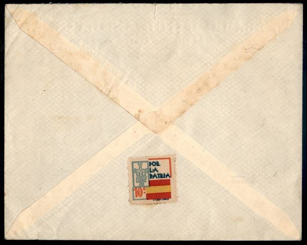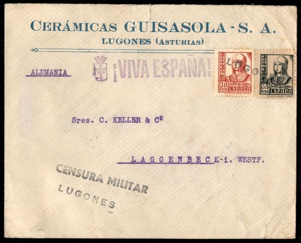 Guerra di Spagna - Busta affrancata con 30 + 15 cent Isabella (770 + 773) + 10 cent Por la Patria da Lugones a Laggenbeck del 1938