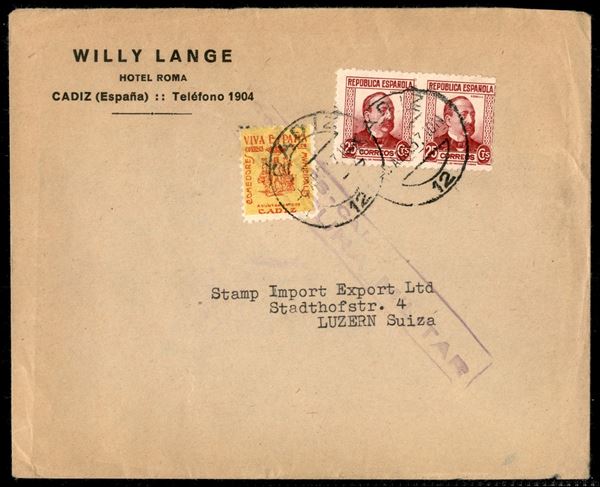 Guerra di Spagna - Busta da Gadiz affrancata con francobollo sovrapprezzo 5 cent + complementari (630) per Lucerna del 5.4.37 - censura