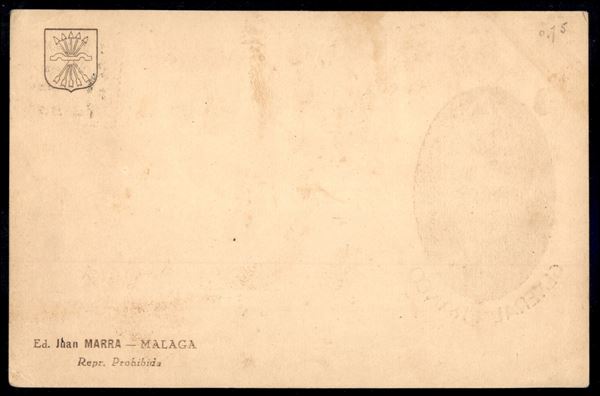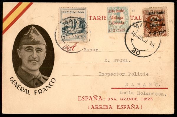 Guerra di Spagna - Cartolina con francobollo sovrapprezzo 5 cent + Malaga Liberada 1 + 2 cent da Malaga a Sabang (Indie Olandesi) del 15.6.37