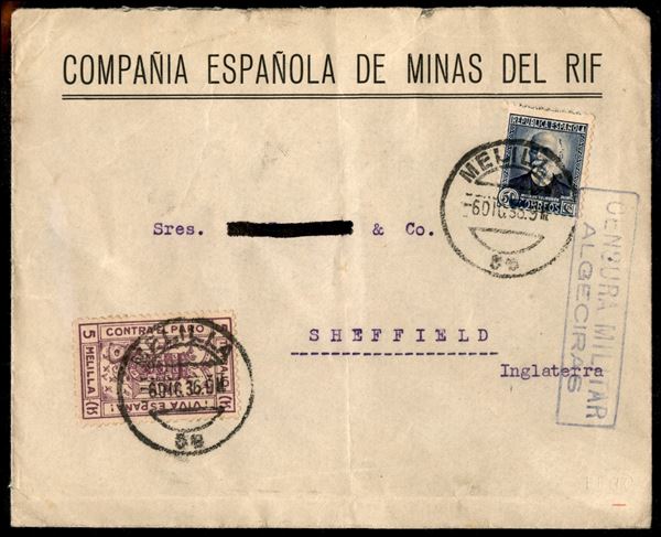 Guerra di Spagna - Due aerogrammi da Melilla uno per Sheffield del 6.12.36 e uno per Stuttgart del 7.7.36 affrancati con francobolli sovrapprezzo ed entrambi censurati