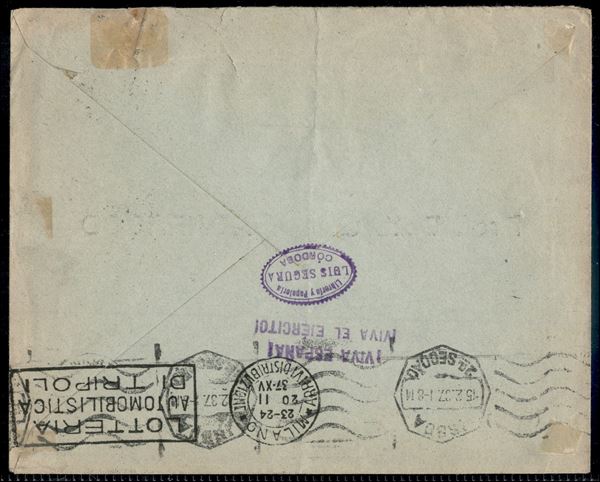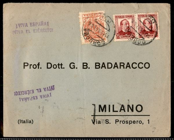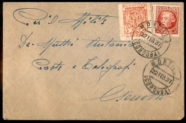 Guerra di Spagna - Tre buste da Cordoba una per la Germania e due per l'Italia con francobolli sovrapprezzo + complementare (630 + 639 + 772) del febbraio 1937