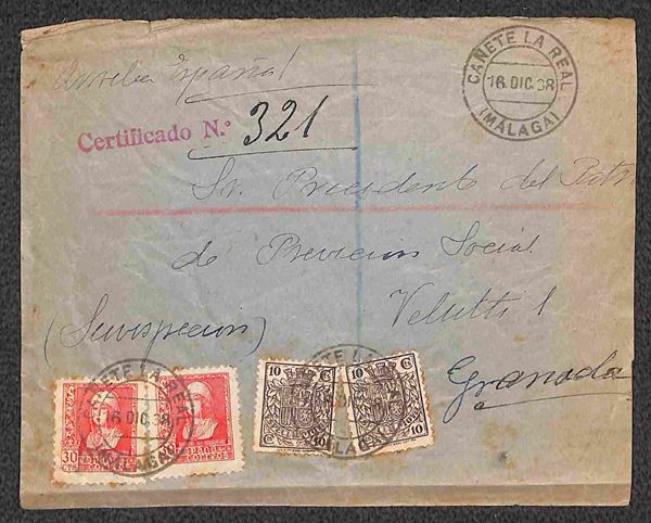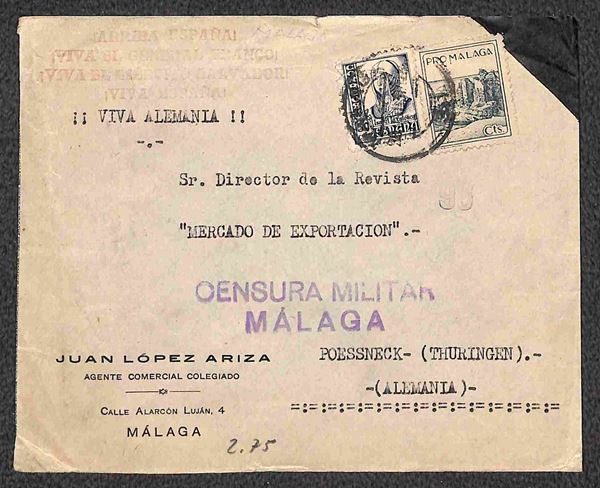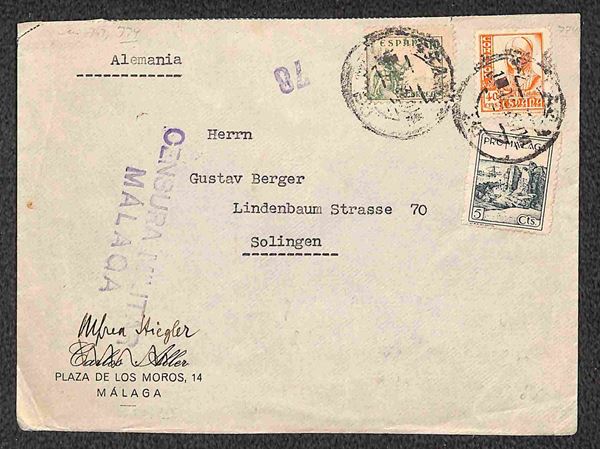 Guerra di Spagna - Tre buste da Malaga con francobolli sovrapprezzo + complementari per la Germania del 1937/1938 - censure