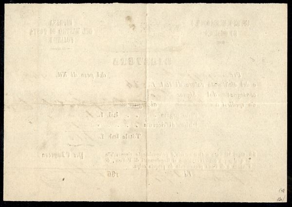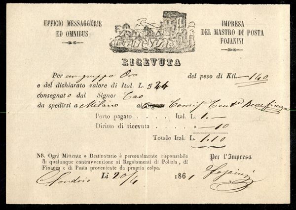Impresa del Mastro di Posta Fojanini - ricevuta pewr spedizione di gruppo oro da Sondrio a Milano del 20.4.1861