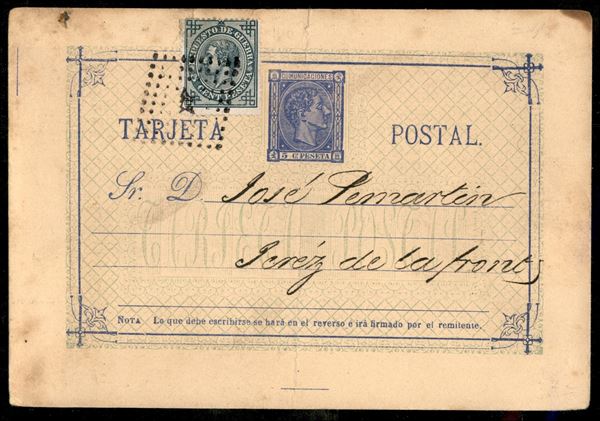 Intero postale pubblicitario da 5 cent (Para Glasgow) + 5 cent (7) annullato con numerale a punti per Jerez de la Frontiera - raro