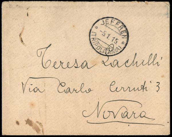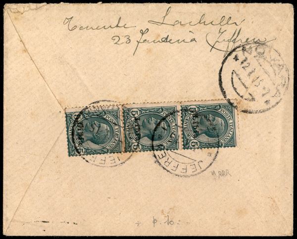 Jeffren (Tripolitania) 5.1.15 - striscia di tre del 5 cent (3) al retro di busta per Novara