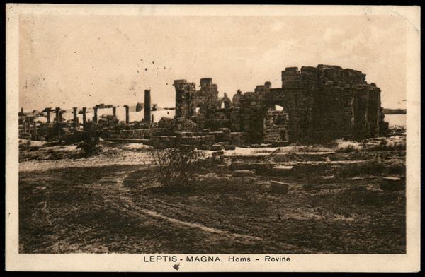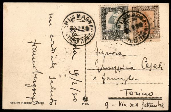 Leptis Magna (Tripolitania) 21.2.30 - 5 cent (60) + 15 cent (62) su cartolina per Torino