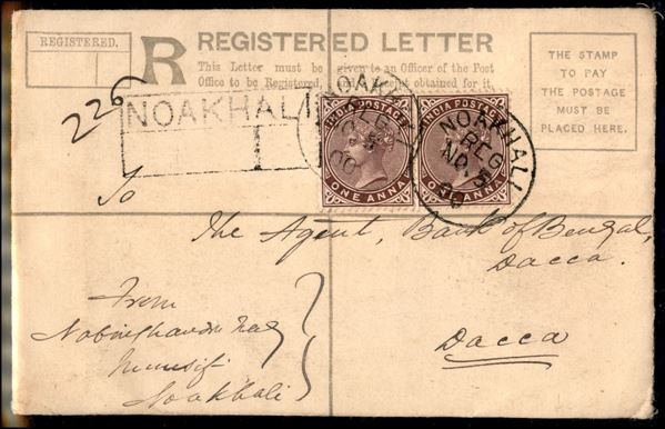 Noakhali (Reg. No. 5) - busta postale raccomandata da 2 annas + complementari per Dacca