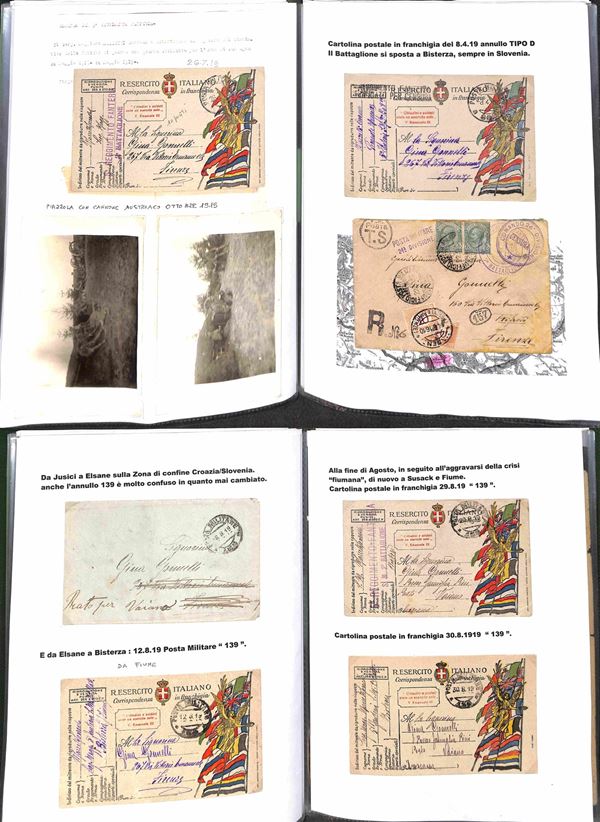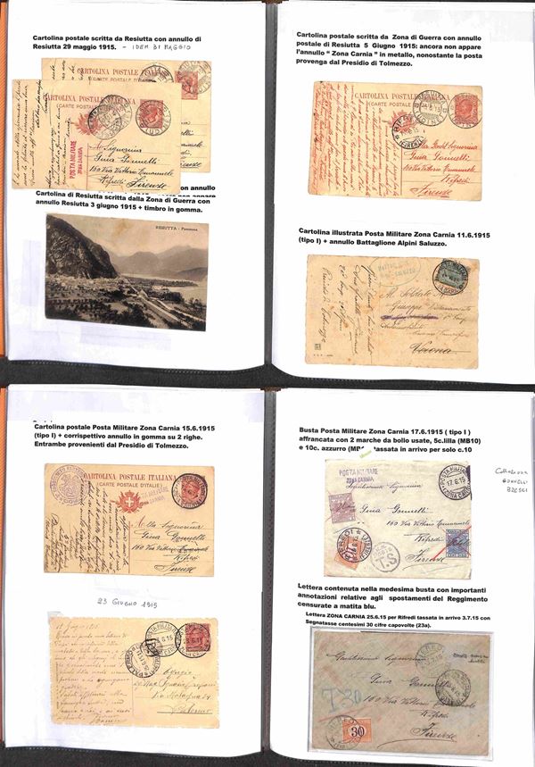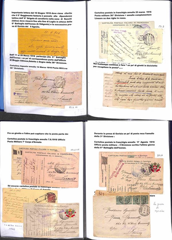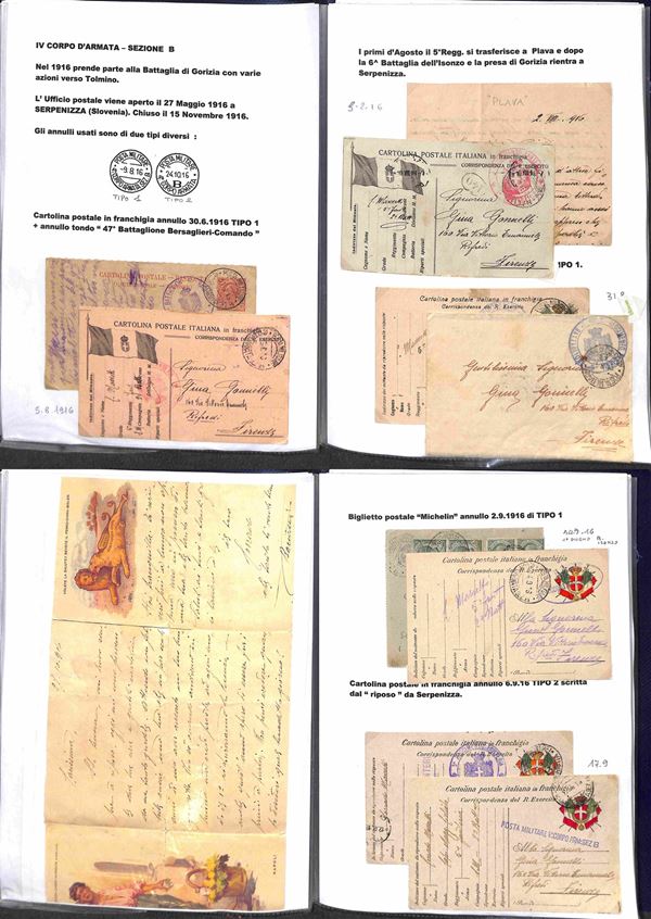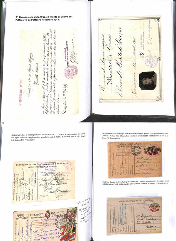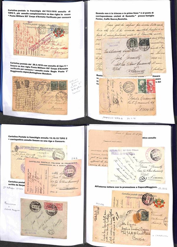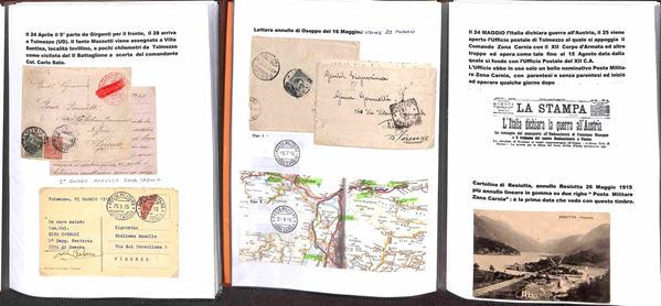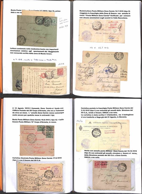 POSTA MILITARE - 1915/1919 - Splendida collezione di cartoline e buste con annulli di Posta Militare della I Guerra Mondiale montata artigianalmente con descrizioni e materiale di completamento in tre portafogli A4 - Oltre 200 cartoline e buste pił molti documenti e lettere del periodo con annulli anche rari - imponente raccolta di interesse storico postale - da esaminare