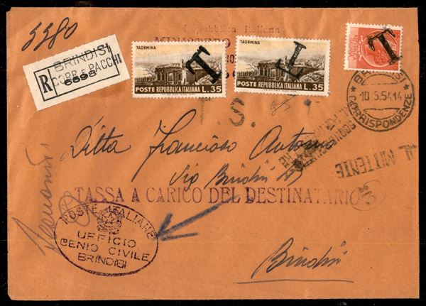 Raccomandata da Brindisi per cittą del 10.5.54 tassata in arrivo per 80 cent (711+731) - Biondi