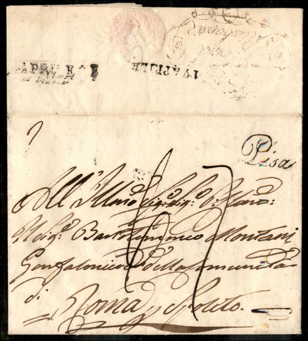 Rimborse (rosso) al retro - lettera da Pisa a Spoleto del 2.4.1818 - tassata/detassata/ritassata - Alfani