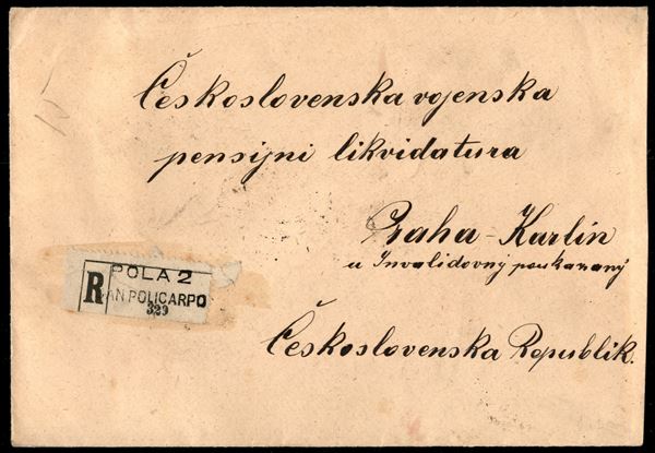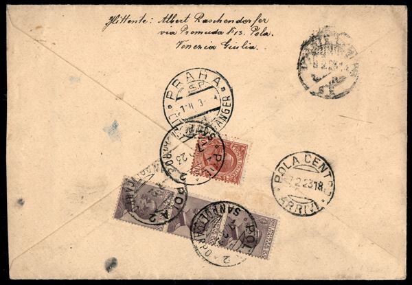 Striscia di tre del 55 cent Michetti (110) + 10 cent Leoni (82) al retro di raccomandata da Pola a Praga del 7.2.23