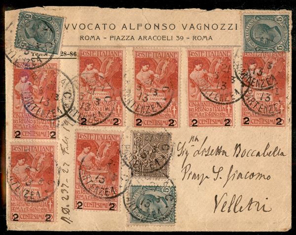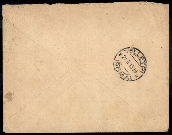 1 cent + tre 5 cent + sette 2 cent su 10 (68 + 81 + 100) su lettera per Velletri da Roma del 21.5.13