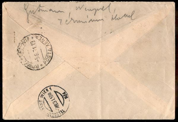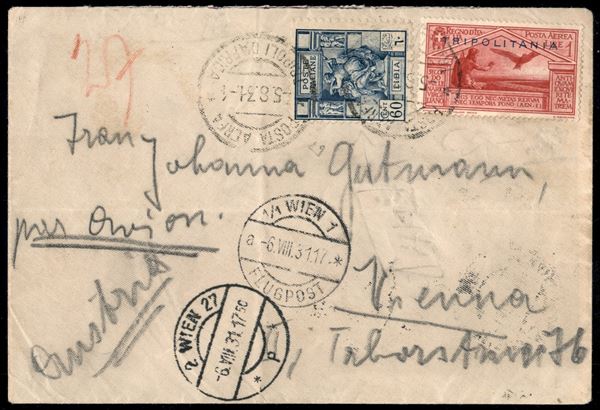 1 lira Virgilio (5 - Aerea) + complementare (42 - Libia) su busta da Tripoli a Vienna del 5.8.31