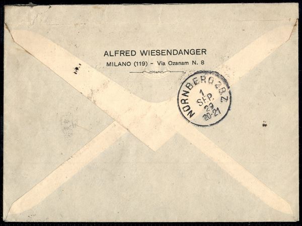 10 cent + 20 cent + 25 cent + coppia 50 cent + 75 cent (245 + 262/65) su raccomandata per l'estero da Milano per Norimberga del 31.8.29