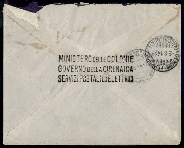 15 cent Michetti (5) con grande piega di carta verticale al centro (non aperta) + 40 cent Michetti (8) - raccomandata da Bengasi a Alessandria del 5.8.1914