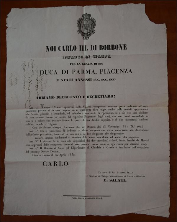 1852 - Decreto di Carlo III per legiferare l'insegnamento giovanile - Parma 19.4.52