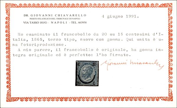 1865 - 20 cent su 15 (25 - terzo tipo) - gomma integra - centratura perfetta - cert. Chiavarello + cert. AG (11.000)