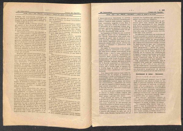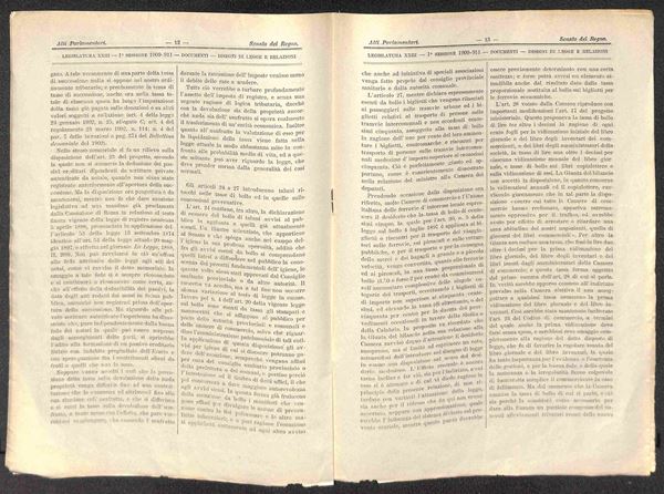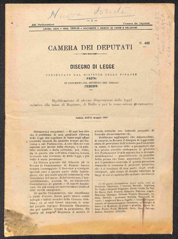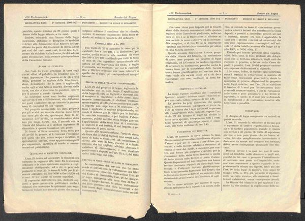 1910/1911 - Senato del Regno - Tasse di Registro e di Bollo - Modificazione di alcune disposizioni delle leggi (Disegno di Legge e Relazioni) - tre fascicoli (28 + 18 + 24 pagine)
