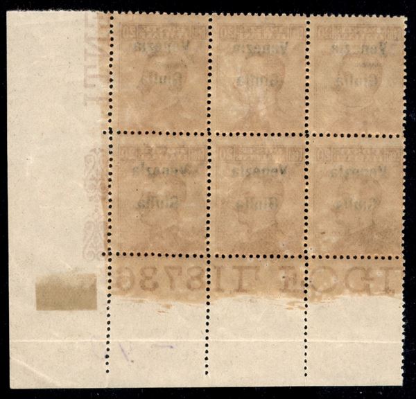 1918 - 20 cent (23) - blocco angolare di 6 con numero di Tavola 8736 - soprastampa in alto - gomma integra