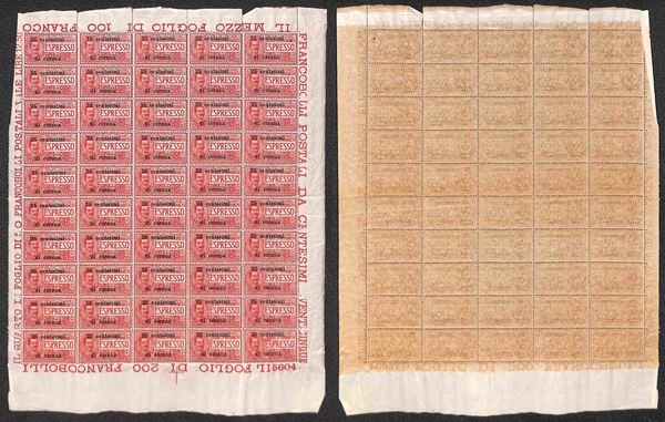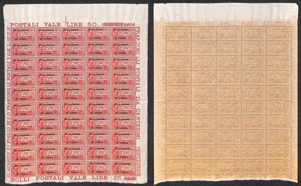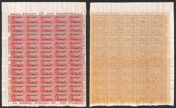 1919 - 25 cent su 25 (1) - quattro fogli di 50 a formare la tavola completa di 200 pezzi con bordi integrali - gomma integra