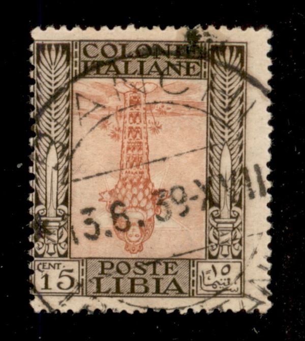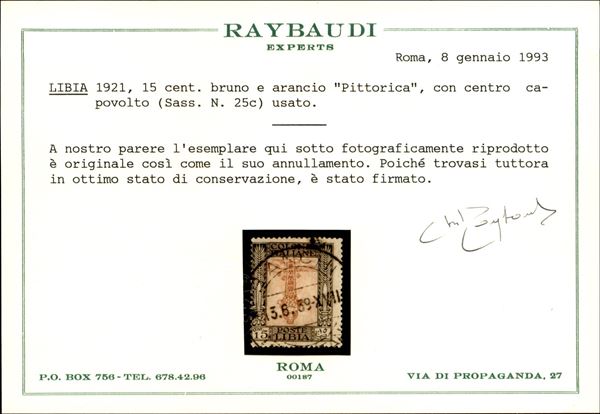 1921 - 15 cent Pittorica (25c) con centro capovolto usato a Bianchi (13.6.39) - raro insieme - cert. Raybaudi