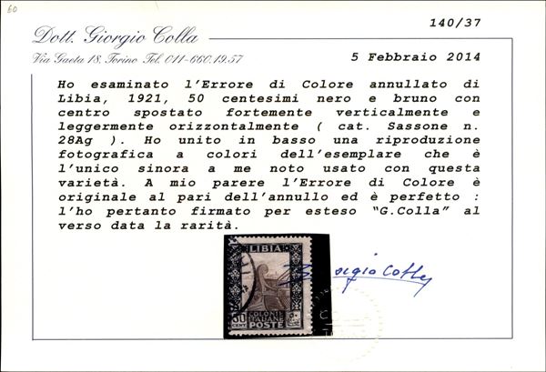 1921 - Errore di Colore - 50 cent Pittorica (28Ag) usato - unico noto con centro spostato (in basso) - cert. Colla - non quotato usato