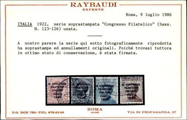 1922 - Congresso Filatelico (123/126) - serie completa usata - cert. Raybaudi