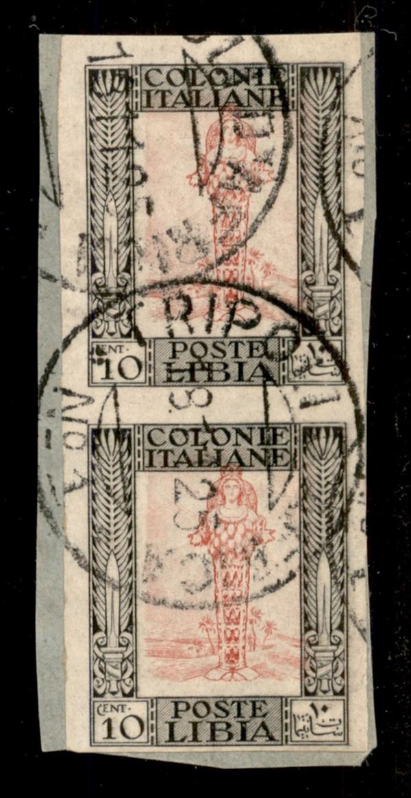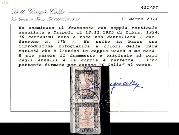 1924 - 10 cent Pittorica (47k) - coppia verticale non dentellata usata su frammento - insieme unico - cert. Colla + cert. AG (18.000+)