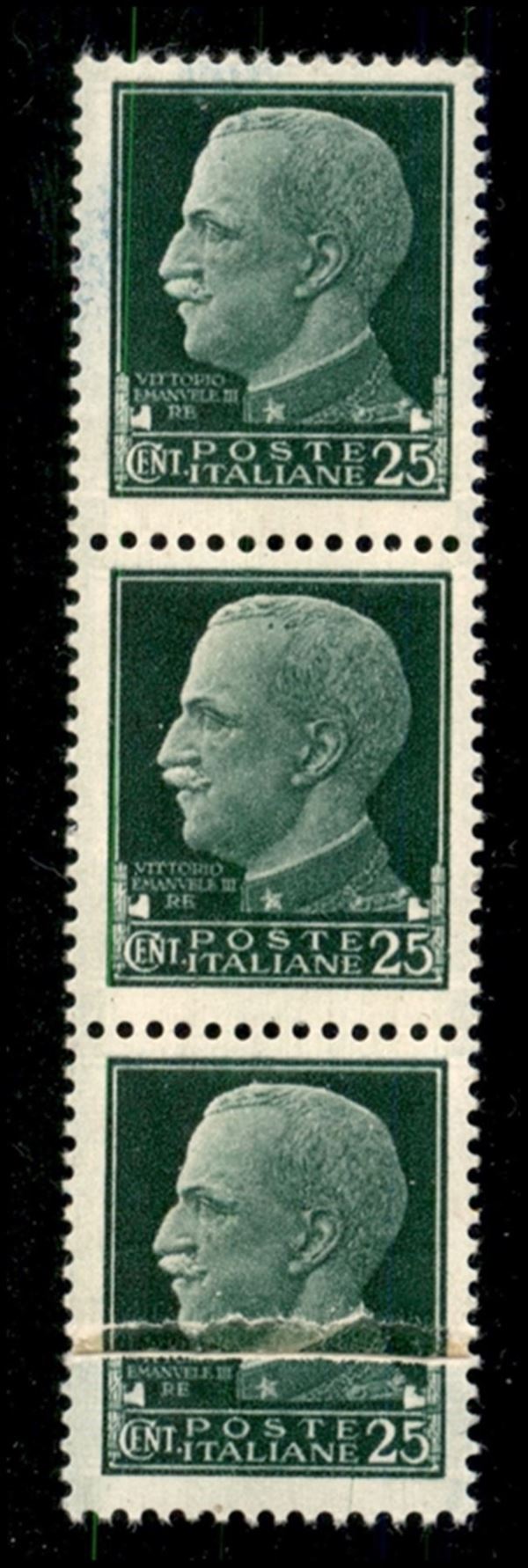 1929 - 25 cent Imperiale (248e) - striscia verticale di tre su carta ricongiunta - gomma integra (3.300)
