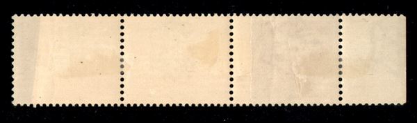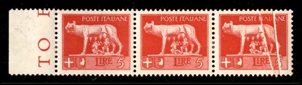 1929 - 5 lire Imperiale (257e) - striscia orizzontale di tre su carta ricongiunta - pezzo di sinistra con pieghe naturali di carta - gomma originale
