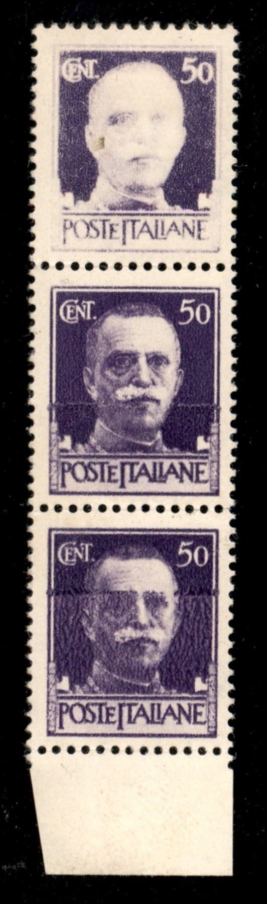 1929 - Imperiale 50 cent striscia verticale di tre bordo foglio in basso con stampa evanescente (251 varietà) - gomma integra
