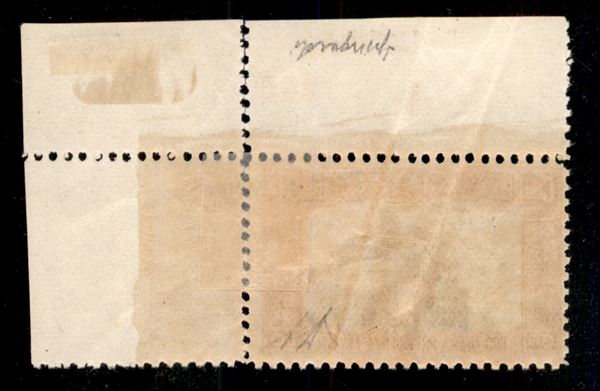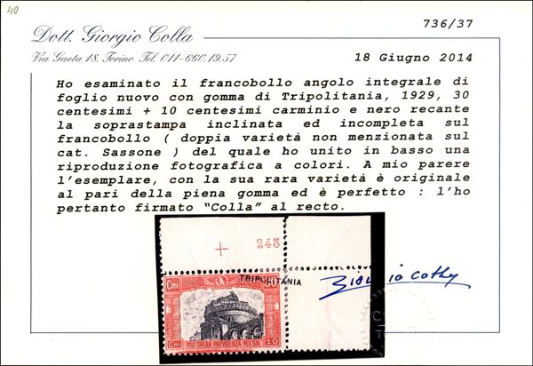 1929 - Tripolita(nia) su 30 + 10 cent Milizia (50a) - con parte della soprastampa (obliqua a cavallo del bordo foglio staccato e unito con linguella) - numero di Tavola in alto - pezzo unico - Diana + Cert. Colla
