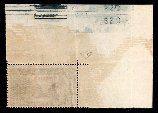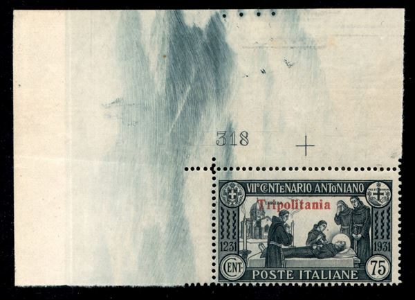 1931 - 75 cent S. Antonio (91 - varietà) angolo di foglio con numero di Tavola (318) - gomma integra - diffusa inchiostrazione al recto con punti di registro + doppia numerazione al retro in alto sul bordo - gomma integra - non catalogato - Diena