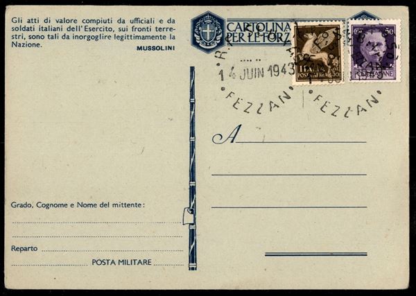 1943 - Cartolina in franchigia delle forze armate con soprastampati a mano Imperiale 0.50/50 cent + Pegaso 0.50/50 cent (11 + Aerea 3) annullati R.F. Sebha Fezzan 4 Juin 1943 - non viaggiata