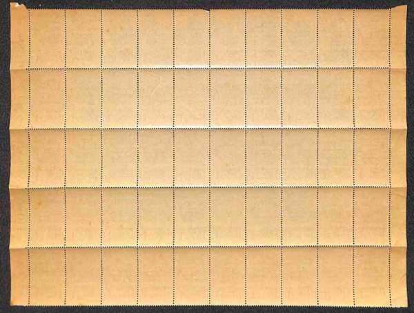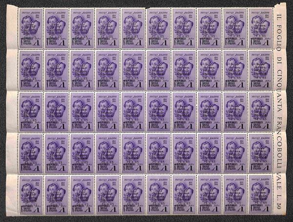 1945 - 1 lira Bandiera (14) - intero foglio di 50 con soprastampe oblique (inclinate dal basso in alto) - consueti errori (sette 14b + sei 14c + cinque 14d) + data su Repubblica (14aa) su alcuni pezzi a sinistra - gomma integra - notate altre imperfezioni della soprastampa - insieme non comune